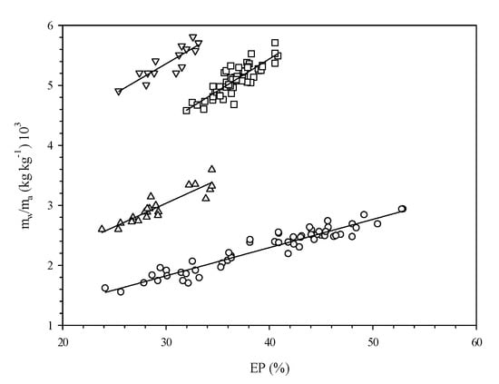 A relationship between the EP and mw/ma values can be obtained from Equations (2) and (3). Figure 6 shows the linear regressions between both variables for different RHo values. Table 3 shows the values for the slope (A) and the ordinate origin (B). The greater mw/ma values correspond to low EP values and are obtained when the RHo is low. The mw/ma values decrease as the RHo increases. The lowest mw/ma values and the highest EP are presented when the RHo is elevated.