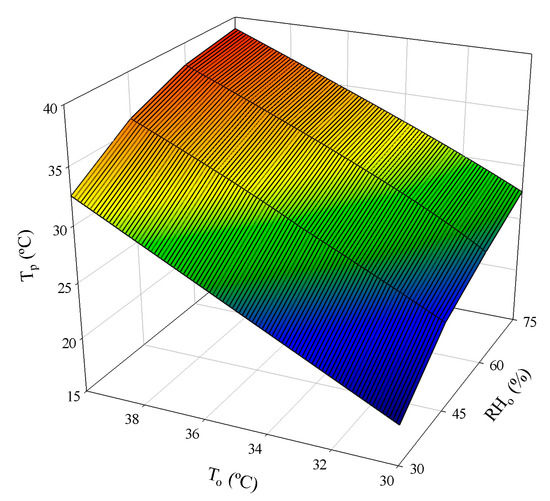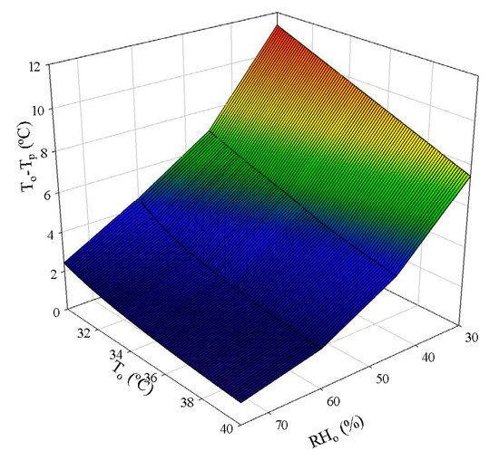 The behaviour of the evaporative cooling value, To–Tp, in function of the state of the outside air is similar to that described for mw/ma. Thus, To–Tp has a value of 11.4 °C when To is 30.0 °C and the RHo is 30%; this is reduced to 7.5 °C if the To is 40.0 °C and the RH is 30%, decreases to 2.4 °C if the To is 30.0 °C and the RH is 75% and finally reduces to 1.1 °C when the To is 40.0 °C and the RHo is 75% (Figure 9).