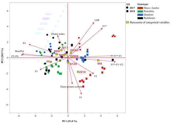 Biplot relative to the principal component analysis performed on grain protein content, gluten index, SDS insoluble (F1*) and soluble protein fraction (F1–F4) separated by SE-HPLC, monomeric/polymeric ratio (mon/pol) and proportion of unextractable polymeric protein. In yellow, the barycenter of the categorical variables, growing season (2017 and 2018), genotype (MA, Marco Aurelio; PF, Pietrafitta; QUAD, Quadrato; RDD, Redidenari) and nitrogen level (N36, N90 and N120) are shown.