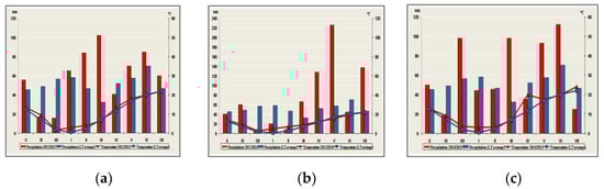 Mean air temperature and amount of precipitation during the study and long-term periods: (a) in 2012/2013; (b) in 2013/2014; and (c) in 2014/2015.