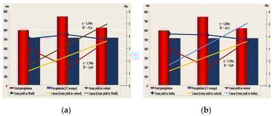 Average grain yield in triticale in tested years, production in Vertisol soil in Serbia 2012/2013–2014/2015: (a) With compared with average grain yield in Word. (b) With compared the average grain yield in Republic of Serbia (b).