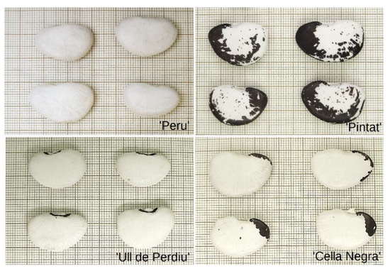 Seed coat color is an important consumer trait. In this group, it is a relevant distinctive character for these traditional cultivars (Figure 1; Table 2). The studied commercial cultivar, identified herein as ‘Peru’, has a completely white seed coat showing no type of pigmentation. The traditional ‘Pintat’ depicts an irregular spotted pigmentation over the whole external cover, from dark maroon to brown, depending on the maturation stage. The ‘Ull de Perdiu’ cultivar has a characteristic black eye surrounding the hilum seed zone. Finally, the cultivar known as locally ‘Cella Negra’ is identified by having a dark brown to black seed tip close to the embryo radicle lobe.