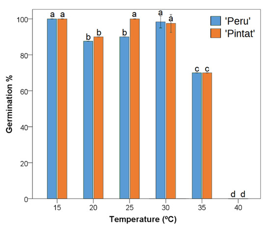 Mean germination time (days) at different temperatures (°C) for ‘Pintat’ and ‘Peru’ cultivars. The same letters indicate homogeneous groups among temperatures (p < 0.05) for each cultivar.