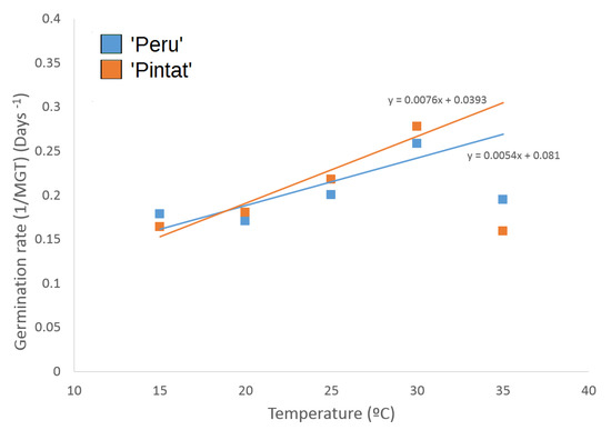 The linear regression of the germination rates (MGT) related to the tested temperatures for two cultivars: ‘Pintat’ and ‘Peru’.