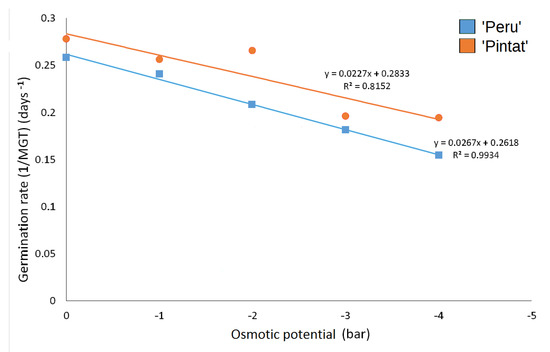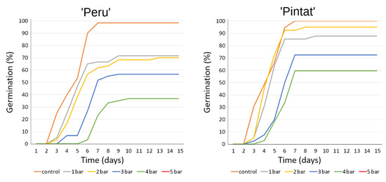 The ‘Pintat’ cultivar displayed a faster response to germination velocity under all the conditions, and only showed a clear decrease from −2 bar (Table 4; Figure 5).