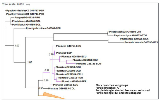 Phylogram depicting the phylogenetic relations among the P. lunatus accessions from Spain and South America obtained with MrBayes and based on nrITS and cpDNA data. Support values are given for the main nodes (BI). Colors correspond to the gene pools for wild P. lunatus: black branches belong to outgroups, purple branches to AI (Andean I) and the purple triangle inside represents collapsed clades of Valencian landraces (local and ‘Peru’) as they were almost genetically identical, the orange triangle represents the MI (Mesoamerican I) and MII (Mesoamerican II) collapsed clades as they did not provide any relevant information for our purposes. The whole tree is shown in the Supplementary Material (Figure S2). COL = Colombia, ECU = Ecuador, PER = Peru, ESP = Spain.