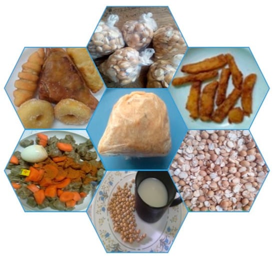 The term ‘Underutilized’ can be used to describe the abandonment of a species by indigenous and international research communities. Underutilized species are generally categorized as crops with little relevance on the global level. These crops, however, play a significant role in terms of climate change and food security, while improving the living standards of low-income families and consumers in developing nations [7,8]. Underutilized crop species, with essential nutrients, can fit into several niches in food production systems and can better adapt to low-input systems in resource-poor regions of the world [9,10]. Presently, these species are either harvested in the wild for cultivation as future or domesticated crops; however, the underutilized crops are mostly cultivated and valued at subsistence or regional levels. In all cases, there is a dearth of research on the production of these underutilized crop species. Despite their neglect, underutilized crops have gained considerable attention from the media in recent times [11], due to their prospects in addressing several UN Sustainable Development [12], and in poor nations of Africa [13] and the Latin America [14]. Additionally, the increasing interest on healthy food alternatives by Western consumers have aided the recent popularity of underutilized crop species [15]. While limited scientific research has been conducted on underutilized crop species, a small number of these species have been adequately researched, mainly due to the commitment of institutions and researchers in the developing world, as well as technical and financial aid from the developed world [16]. Considering their numerous dietary values and tolerance to harsh environmental conditions, some of these underutilized crop species, such as Bambara groundnut, are regarded as crops for the future. Additionally, these crops are highly fortified, with essential nutrients that are excellent in promoting health, and have the ability to combat malnutrition and other related diseases. However, these important species usually fall short of essential, commercial valued crops, such as high yielding varieties that may attract growers with extensive resources and inputs required to achieve the improved yield performance of the crops [17,18]. Incorporating these underutilized crop species, specifically Bambara groundnut, in diversifying the food chain can have a positive impact by serving as a general tool for improving human nutrition. Bambara groundnut is highly nutritious, making it relevant in the nutritional formulation of people that cannot afford expensive protein sources, especially animal-based protein [19]. The seed of Bambara groundnut contains 61–69% carbohydrate, protein 17–27%, fiber 3.3–6.4%, ash 3.1–4.4%, and fat 3.6–7.4%, thus making it a valuable dietary source [20,21]. It also contains 95.5–99.0 mg Ca, 5.1–9.0 mg K, and 2.9–10.6 mg Na per 100 g, with a substantial amount of Zinc (20.98 ± 1.07 mg/100g), which may have a significant impact on preventing prostate cancer in men [22]. The freshly harvested pods, as well as the dry seeds, are processed and consumed in different forms (Figure 1). Freshly harvested pods are boiled or grilled and consumed as snacks [23]. The seeds have a higher content (80%) of high-quality amino acids, such as arginine, leucine, valine, methionine, and lysine, as compared to cowpea, soybeans and groundnut (64%, 74% and 65%, respectively), and may potentially complement the deficient essential amino acid content of foods [22].