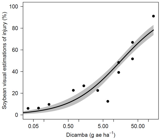 in which y corresponds to the biomass reduction and visual estimations of injury (%), x represents dicamba dosage, b is the slope at the inflection point, c is the lower limit of the model, d is the upper limit, and e is the inflection point that represent the dosage that caused 50% injury or 50% yield loss. Visual injury and yield data were pooled over years and locations for non-linear regression to provide maximum prediction power to the model.