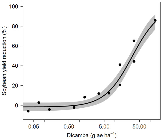 Dicamba is a synthetic auxin that can induce distinct injury on sensitive plants, including leaf cupping, leaf crinkling, stem twisting, chlorosis on terminal leaves, abnormal leaf venation, swollen petiole bases, stunting, and necrosis, etc. [6,9,11]. The soybean response to dicamba has been widely studied and dosages as low as 0.028 g ae ha−1 (0.005% of 560 g ae ha−1 use rate) have been shown to cause symptomology [2,4,9,12,13]. The degree of damage can differ based on the crop stage at the time of exposure, with consistently higher yield loss potential for reproductive stages as opposed to vegetative stages by two to six-fold [2,6,9]. For example, Griffin et al. [6] observed 4 and 15% soybean yield losses following dicamba exposure during V2–V3 stages at 4.4 and 17.5 g ae ha−1, respectively, and 10 and 36% reductions exposed during R1 stages using the same rates. In another study, the dicamba dosage predicted to cause 5% yield loss was 5.8 and 1.0 g ae ha−1 for V2-3 and R1 stages, respectively [9]. Similarly, a meta-analysis pooled data from multiple published studies found dosages predicted to cause 5% soybean yield loss ranged from 1.6 to 24, 1.2 to 47, and 0.15 to 14 g ae ha−1 for V1-3, V4-7, and R1-2 stages, respectively [2]. The available literature indicates the potential for soybean recovery is greatest when exposed at vegetative stages and exposure during reproductive stages has the highest risk for yield reduction [2,3,6,9]. However, soybean yield loss due to dicamba exposure can be inconsistent due to environmental conditions and plant vigor [2,3,4,6,9,14,15,16,17].