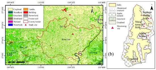 Land use distribution (a) and the locations of the four experimental sloping land uses (b) in the study area. The land use data were obtained from the global land cover with 30 m resolution (GlobalLand30) for the year 2010, produced by National Geomatics Center of China (http://www.globallandcover.com/GLC30Download/index.aspx).