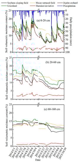 Dynamic changes of daily average soil moisture content in (a) 0–20 cm, (b) 20–60 cm, and (c) 60–160 cm soil layers and soil moisture standard deviation under different sloping land uses in 2014 and 2015 growing seasons. Due to the late installation of monitoring devices for soybean sloping field, soil moisture and temperature were collected from May 29, 2014. The standard deviation refers to the mean square error of daily average soil moisture content between soybean sloping field, maize terraced field, jujube orchard, and grassland, which can reflect the dispersion and difference in daily average soil moisture content between the four sloping land uses.
