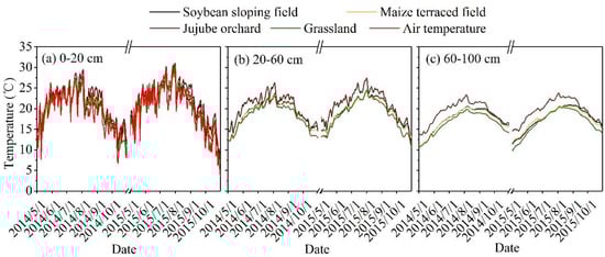 Soil temperature fluctuated violently in 0–20 cm soil layer under four experimental sloping land uses, indicating that it was greatly affected by air temperature (Figure 4a). With the deepening of the soil layer, the daily average soil temperature gradually decreased for the same sloping land use, and the fluctuation range was also reduced. Taking the 2015 growing season as an example, the soil temperature of soybean sloping field, maize terraced field, jujube orchard, and grassland in 0–20 cm soil layer was 21.1, 20.7, 22.2, and 20.6 °C, and the fluctuation range was 22.1, 20.8, 23.2, and 25.3 °C, respectively (Figure 4a). To 60–100 cm soil layer, the soil temperature of soybean sloping field, maize terraced field, jujube orchard, and grassland decreased to 17.7, 17.7, 19.6, and 16.8 °C, respectively, and the fluctuation range decreased to 9.6, 9.0, 9.3, 10.8 °C in turn (Figure 4c).
