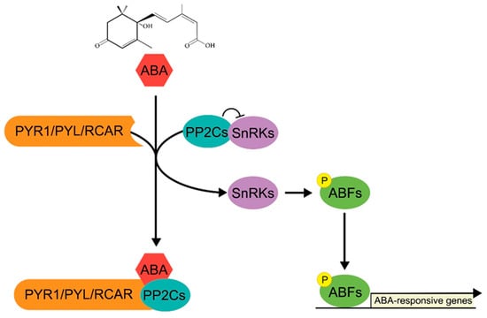 The ABA signaling pathway initiates with recognition of ABA by a complex including Pyrabactin Resistance 1 (PYR1)/PYR-Like (PYL)/Regulatory Component of ABA Receptor (RCAR) and signal transduction by Protein Phosphatase Type 2Cs (PP2Cs), and SNF1-Related Protein KINASES TYPE 2s (SnRK2s) [26]. These activate the ABA signaling-specific ABA-Responsive Element Binding Factor (ABF) transcription factors, which belong to a distinct subfamily of bZIP transcription factor, and regulate the expression of ABA-responsive genes, leading to the establishment of stress-specific transcription [27,28,29]. SnRK2s activate ABFs through direct phosphorylation. In the absence of ABA, PP2Cs inhibit the kinase activity of SnRK2s, thus blocking activation of the ABFs. When plants are exposed to abiotic stress, ABA biosynthesis is promoted, resulting in formation of the PYR/PYL–PP2C complex, which inhibits PP2C activity, thus activating SnRK2s to phosphorylate and activate ABFs [30] (Figure 1). The activated ABFs directly bind to the ABA-responsive element (ABRE), a major cis-element in ABA-responsive genes [31], and activate the transcription of other stress-responsive transcription factors, such as NACs and AP2/ERFs, which are also responsible for the expression of stress-responsive genes [32]. This transcriptional cascade changes the genome-wide transcription profile, inducing the plant defense system, to adapt to and survive the abiotic stress, suggesting that stress-responsive bZIPs, including ABFs, are essential components of the plant response and tolerance to abiotic stress [33,34].
