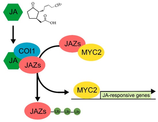 A schematic of JA signaling pathway. MYC2 is a key transcription factor responsible for expression of JA-responsive genes. In the absence of JA, the transcription activity of MYC2 is suppressed by direct interaction with JAZs. In JA condition, JA interacts with the JA receptor COI1 and provokes ubiquitin (Ub)-mediated proteolysis of JAZs, leading to activation of MYC2 and expression of JA-responsive genes.