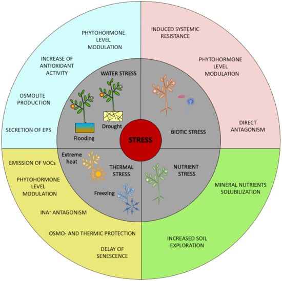 Among fungi, the endosymbiotic genus Trichoderma is the most investigated and applied, due to its ability to promote plant growth and defenses, produce antimicrobial substances, parasitize fungal pathogens and prey on nematodes [,,]. In the case of Arbuscule-Forming Mycorrhiza (AFM), the difficulties of in vitro cultivation, and the lack of comprehension of host specificity determinants and population dynamics in the agroecosystem may play against their use in commercial products, in spite of the beneficial effects exerted on their host plants, such as the increase in nutritional efficiency and in the protection from biotic and abiotic stresses (Figure 1) [,].