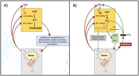 Water limitation also impairs nutrient uptake by plant roots, including nitrogen compounds. This multistress condition promotes ethylene production, that, triggering stress responses, inhibits plant growth and carbon availability for associated microbes (Figure 2A). Thus, mechanisms enacted by plant symbiotic microbes can be based on ACC subtraction, reducing ethylene production and relieving ethylene-mediated inhibition [], and/or IAA production to stimulate plant growth and root branching (and consequent exchange of resources with rhizospheric microflora). IAA production was found to be responsible for plant growth promoting effects by several microbes under nitrogen shortage conditions [,]. Notably, some of the identified genera (Sinorhizobium/Ensifer, Serratia, Arthrobacter, Alcaligenes, Bacillus) are likely N-fixing bacteria. In addition, IAA- and ACC deaminase-based metabolisms are mutually integrated, since IAA may stimulate ACC synthase, and ACC deaminase recirculates ammonium, making it available for other plant or bacterial metabolic needs (Figure 2B).