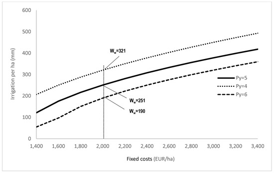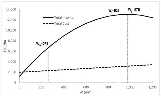 28], excluding the variable water cost. In our optimisation exercise, the cost of 2000 EUR is considered, although sensitivity analysis in the range 1800–2500 EUR·ha