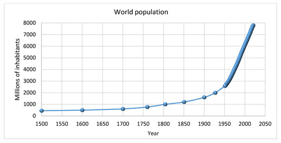 Development of the world population over recent centuries. Plot based on the data from Worldometer’s “World Population by Year” [2].