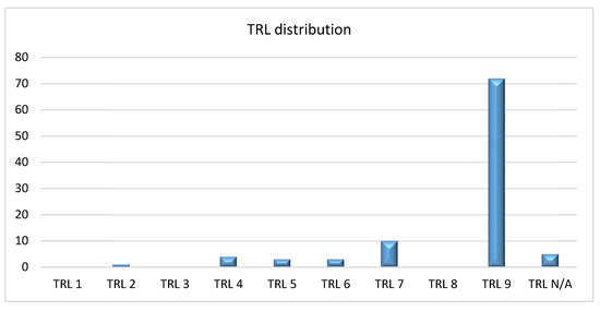 Distribution of tools according to their technology readiness level, shown in Figure 5, reflects the objectives of the search. The project targeted at maximizing the potential benefits to the stakeholders, and thus focused mainly on tools and services readily available on the market. The lack of solutions with TRL 8 is mainly due to the classification methodology, where items with TRL in the range of 7–9 were assigned to the group of TRL 9.