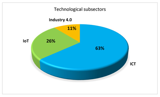 Figure 6 presents the distribution of the findings among the ICT, IoT, and Industry 4.0 subsectors. The overwhelming dominance of ICT is not surprising since it is the most agile sector. Software tools can relatively easily be adapted to different markets, since usually there are less constraints of physical instrumentation than, e.g., in IoT systems. Industry 4.0 solutions, on the other hand, are quite often tightly related to a certain process and an application site, and thus call for customized implementations.