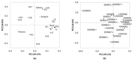 A Principal Component Analysis was performed using the mean GC-peak area values of individual VOCs, total levels, and the content in sinigrin for each population (Figure 2). The first two components explained together 61.1% of the total variance, with the first component contributing to 43.1% of variation. The first component was positively correlated to the ITCs compounds, where values for component loadings were >0.2 (Figure 2a). Allyl ITC (I1) grouped together with the total level of ITCs and the total level of VOCs. This result is in agreement with the previous identification of allyl ITC as the main volatile in wall rocket and therefore the greatest contributor to the total added area of VOCs. The first component also had a positive correlation with the content in sinigrin. On the contrary, esters were not grouped by neither the first nor the second component. As exception, cis-3-hexenyl isovalerate (E4) and cis-3-hexenyl valerate (E5) clustered together; indeed, the Spearman ordinal correlation between both compounds was highly significant and positive (ρ = 0.945; p < 0.001). On the other hand, the second component accounted for 18.0% of total variance (Figure 2a). It was also positively correlated to the content in sinigrin. In addition, this component clustered three of the four compounds included in the miscellaneous group. Cis-3-hexen-1-ol (O1) was closely grouped with the total sum of this group as it was the greatest contributor.