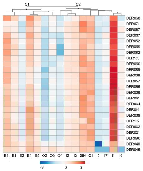 On the other hand, the score plot of the PCA revealed the relationship between the materials (Figure 2b). Most of the populations grouped close in the analysis, although some populations were separated along either the first or second component. Thus, DER045 clearly separated in the first component, placed on the left of the graphic. As previously described, this population had the lowest level in ITCs combined with high levels of esters (Table 2). Its different profile was also observed in the Hierarchical Cluster Analysis (Figure 3). Similarly, DER068 was also separated within this first component (Figure 2b). This population showed the highest level of esters, but also an increase in the level of ITCs compared to DER045 (Table 2). Regarding the second component, it grouped populations DER071 and DER087 in a separated cluster on the top of the graphic (Figure 2b). Both populations shared a high accumulation of sinigrin and low in esters (Table 2, Table 5).