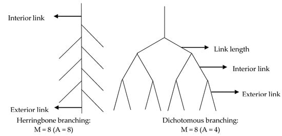 Two extreme patterns of root topology were proposed: herringbone and dichotomous branching [18,19] (Figure 1). With both patterns, topological index (TI) is used to reflect the branching patterns of different plant roots, and is defined as log altitude (A)/log magnitude (M) (A is the total number of internal links in the root system and M is the total number of external links in the root system). Most studies [15,36] have shown that the majority of plant root topologies are between dichotomous and herringbone branching patterns. The root system tends to exhibit herringbone branching when TI is close to 1, and dichotomous branching when TI is close to 0.5.