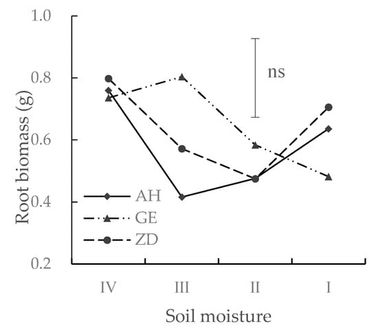 Interaction on root biomass between cultivars (Aohan (AH), Golden empress (GE) and Zhaodong (ZD)) and soil moisture (I: 75–80% water holding capacity, II: 60–65% followed by rehydration to 75–80% water holding capacity, III: 45–50% followed by rehydration 60–65% and 75–80% water holding capacity, and IV: 30–35% followed by rehydration to 45–50%, 60–65%, and 75–80% water holding capacity.). The vertical bars indicate the least significant difference (L.S.D.); ns-no significant.