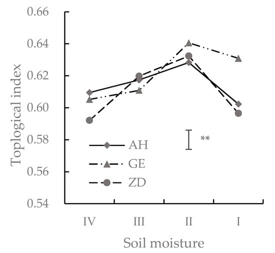 Interaction on topological index between cultivars (AH, GE and ZD) and soil moisture (See Figure 2 for soil moisture abbreviations). ** p < 0.01.