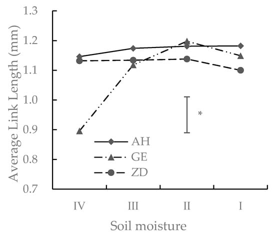 Interaction on link average length between cultivars (AH, GE and ZD) and soil moisture (See Figure 2 for soil moisture abbreviations). * p < 0.05.