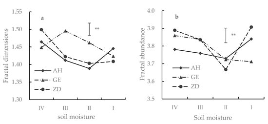 Interaction on (a) fractal dimension and (b) fractal abundances between cultivars (AH, GE and ZD) and soil moisture (See Figure 2 for soil moisture abbreviations). ** p < 0.01.
