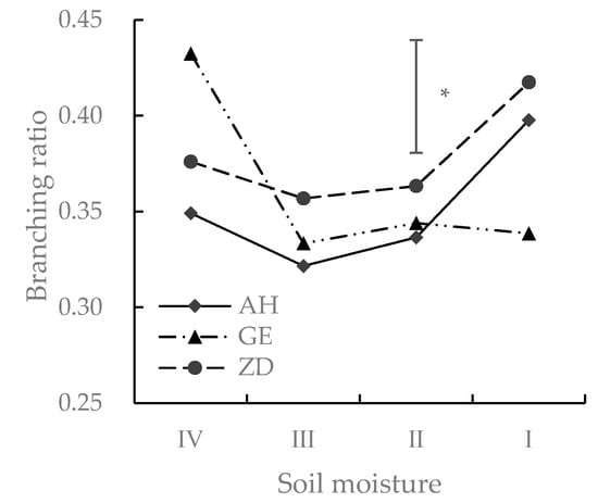 Interaction on branching ratio between cultivars (AH, GE and ZD) and soil moisture (See Figure 2 for soil moisture abbreviations). * p < 0.05.