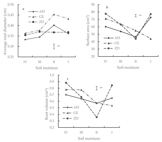 There were significant (p < 0.01) differences in average root diameter, root surface area and root volume among alfalfa cultivars and among soil moisture regimes (Table 8), and there were significant (p < 0.01) interactions between alfalfa cultivar and soil moisture on average root diameter, root surface area and root volume (Figure 7a–c). Root average diameter was higher (mean = 0.41 cm) when soil moisture was at 60–65% water holding capacity followed by rehydration to 75–80% water holding capacity. On the contrary, the average root diameter was the least when soil moisture was at 30–35% followed by rehydration to 45–50%, 60–65% and 75–80% water holding capacity (Table 8). The average root diameters of AH and GE increased first and then decreased, whereas that of ZD remained at 0.35–0.37 cm. The root surface area and root volume of AH and ZD were lowest when soil moisture was at 60–65% water holding capacity followed by rehydration to 75–80% water holding capacity (Figure 7b,c). However, the root surface area and volume of GE appeared to decline with decreasing soil moisture stress followed by rehydration to 75–80% water holding capacity.