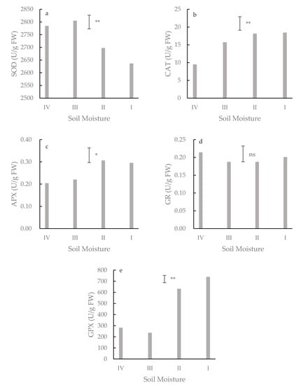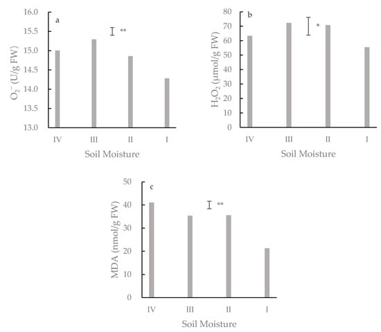 Drought stress induces a loss of balance between the light reactions and the Calvin–Benson cycle, which resulted in the production of ROS by the transfer of electrons to molecular oxygen. The production of ROS will increase when plants are subjected to diversified stress [65]. In our experiment, free radicals (O2− generation rate) and nonradical compounds (H2O2) were higher in both soil moisture treatments except for the control.