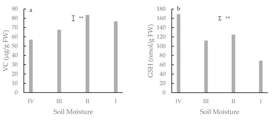 The enzyme SOD acts as a first line of defense by catalyzing O2− into H2O2 and O2. In return, other antioxidant enzymes such as APX, CAT, POD, and GR break down H2O2 using different pathways [69]. CAT is a tetrameric heme-containing enzyme responsible for catalyzing the dismutation of H2O2 into H2O and O2. In our experiment, the CAT activity was lower among soil moisture treatments than the control (soil moisture at 75–80% water holding capacity) indicating that drought and subsequent rehydration could decrease CAT activity. However, whether this decrease was attributed to moisture stress or rehydration needs further investigation given various moisture stress levels followed by rehydration were treated as systems to mimic practical scenarios in the current experiment. In addition, APX, GPX, and GR are potential enzymes that participate in the AsA-GSH cycle playing indispensable roles in scavenging ROS and maintaining the AsA and GSH levels [70]. GPX and GR also participated in the ROS-scavenging process by the conversion between GSH and Oxidized glutathione (GSSG) [67]. The GPX activity under more stressful water deficit followed by rehydration demonstrated that antioxidant defense systems in the ROS-scavenging process could be impaired to a higher degree under these treatment conditions. GSH can help to maintain normal immune system function and has antioxidant and detoxification effects [71]. The content of GSH was greater for all soil moisture stress and rehydration treatments than the control (75–80% water holding capacity) in this experiment, probably reflecting the plant’s response to maintain its immune system under a water deficit. APX is engaged in the ROS scavenging process by converting AsA to dehydroascorbate (DHA) [72], which caused the decline of APX activity and AsA content under severe drought stress followed by rehydration (Figure 9a and Figure 10c). These results revealed the tolerance of alfalfa root in antioxidant defense system in response to water deficit and rehydration.