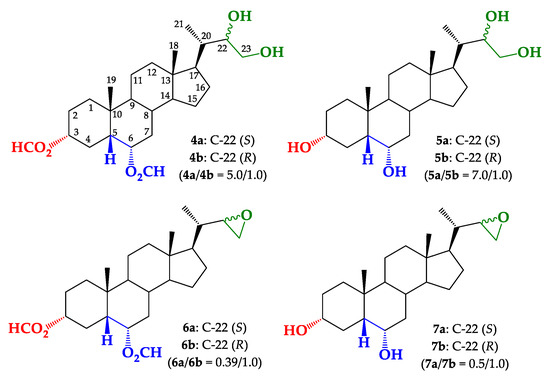 It has been reported that the epoxidation reaction on steroidal nuclei of similar structure and carrying terminal double bonds C22/C23 mainly produces epoxide 22R [45,46,47,49]. Epoxidation of alkene 3 with m-CPBA (step V, Figure 3) leads to a mixture of epimeric epoxides 6a/6b in the ratio 0.39:1.0, with 94% yield. Thus, our results are in line with previous work, and the amount of epoxide 22R is twofold larger than that of 22S. This proportion was calculated using the integrals of signals assigned to hydrogens H-22 (δ = 2.73 ppm), H-23α (δ = 2.58 ppm) and H-23β (δ = 2.80 ppm) of compound 6b (22R), and H-22 (δ = 2.62 ppm), H-23α (δ = 2.40 ppm) and H-23β (δ = 2.66 ppm) of compound 6a (22S) (see Figure S5, Supplementary Materials). For the determination of the majority epoxide, experimental and NMR comparisons spectroscopic data correlations were used. Finally, saponification of epoxides 6a/6b produces 7a/7b with 93% yield (step IV, Figure 3). The ratio of 7a/7b epimers in the mixture was calculated as 7a/7b = 0.5/1, following the same procedure described for the mixture 6a/6b. (Figure S6, Supplementary Materials)