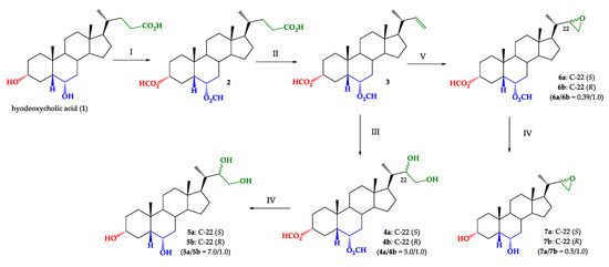 Obtaining epimeric mixtures 4a/4b, 5a/5b, 6a/6b and 7a/7b from hyodeoxycholic acid (1). Conditions. I. HCOOH/H2SO4 (Reflux); II. Pb(OAc)4, Cu(OAc)2/C6H6 (Reflux); III. OsO4, NMO/(CH3)2CO/H2O; IV. K2CO3/MeOH (Reflux), HCl 2%; V. m-CPBA/CH2Cl2/NaHCO3.