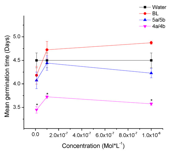 Effect of epimeric mixtures (4a/4b and 5a/5b) and BL on the mean germination time of tomato seeds after five days of germination. * Indicates the most significant different values as compared to the negative control.