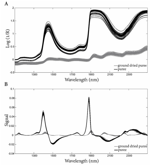 (A) Raw spectra from puree and ground dried puree; (B) pretreated spectra (SNV) from puree and ground dried puree.