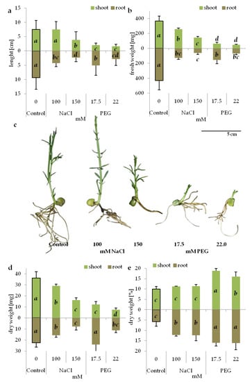 Biometric parameters of 14-day old grass pea seedlings under NaCl and PEG-induced stress; (a) length of shoots and roots, (b) fresh weight of single shoot and root, (c) morphology of seedlings, (d) dry weight of single shoot and root, (e) percentage of shoot and root dry weight content. Different letters in italic denote significant differences at p ≤ 0.05 within one organ.