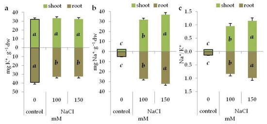 In 14-day old grass pea seedlings treated with NaCl, the content of K+ ions did not change in the shoots, but decreased significantly in the roots (Figure 2a). In turn, sodium ion accumulation increased gradually with increasing NaCl concentration in the medium, both in the shoots and roots (Figure 2b). The Na+/K+ ratio changed in the same way (Figure 2c).