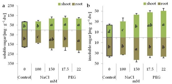 Soluble (a) and insoluble (b) sugar content in the shoots and roots of 14-day old grass pea seedlings under NaCl and PEG-induced stress. Different letters denote significant differences at p ≤ 0.05 within one cultivar and organ.