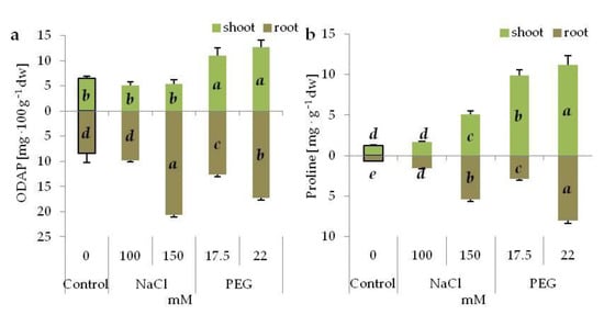 ODAP accumulation increased both in the shoots and roots under PEG stress (Figure 5a). Moreover, its significantly higher content was noted in the shoots grown in the media with PEG than that with NaCl. In the roots, accumulation of ODAP was also noted with a higher concentration of NaCl, and it was greater than for the corresponding PEG concentration (Figure 5a).