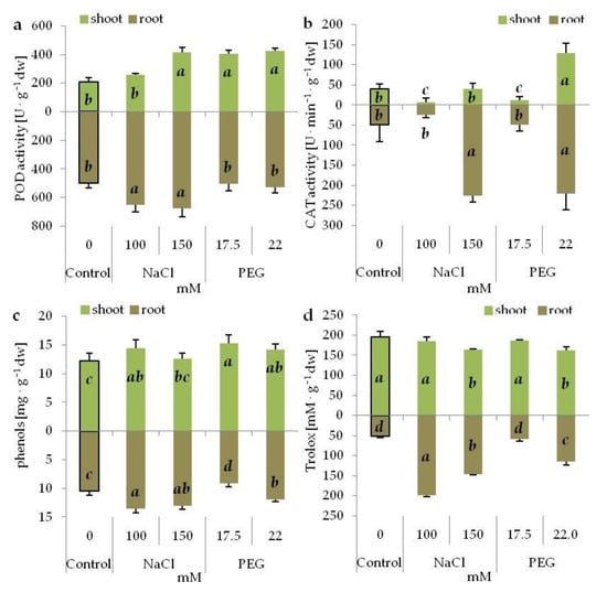 Peroxidase (POD) (a) and catalase (CAT) (b) activity, phenolic compound content (c) and total antioxidant capacity (as Trolox equivalent) (d) in the shoots and roots of 14-day old grass pea seedlings under NaCl and PEG-induced stress. Different letters in italic denote significant differences at p ≤ 0.05 within one organ.