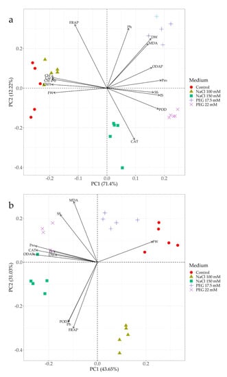 PCA biplots were generated for shoots and roots separately. They indicated that both principal components explained almost 84% of the total variance in the shoots, with the first principal component (PC1) explaining 71.4%, and the second (PC2) only 12.22% (Figure 7a). The analysis revealed clear differences in grass pea shoot responses depending on the medium used, as distinguished by PC1. Under drought stress induced by PEG, shoot response was rather similar, regardless of the stressor concentration. Under salt stress, a lower NaCl concentration resulted in a similar plant response as the control, while a higher sodium chloride concentration triggered a different reaction, as distinguished by PC1 and PC2 (Figure 7a). The PCA biplots explained also almost 75% (PC1: 43.65%, PC2: 31.03%) of the total variance in the roots (Figure 7b). Plant roots reacted similarly, regardless of the stressor concentration, with a clear difference in reaction between PEG and NaCl, as explained by the second principal component (PC2) (Figure 7b). Furthermore, the analysis revealed that the mechanism of response to drought stress in shoot cells was associated with an increase in the content of proline, ODAP, soluble and insoluble sugars and POD activity. Additionally, these parameters correlated negatively with the content of photosynthetic pigments and fresh weight (Figure 7a). The response to the higher NaCl level involved CAT activity. The analysis also revealed positive correlations between ODAP, proline and sugars, and negative correlations between CAT activity and total antioxidant capacity (Figure 7a). In the roots, the response to salinity stress manifested in increased POD activity, phenol accumulation and total antioxidant capacity, which were also positively correlated (Figure 7b). In turn, root response to drought stress manifested in increased soluble sugar accumulation and MDA content (Figure 7b). Furthermore, in the case of more intense stress (both drought and salinity), the roots responded similarly by increasing accumulation of proline, ODAP, insoluble sugar, dry weight and activity of CAT (Figure 7b).