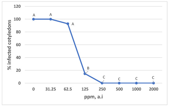 Timorex Gold at 0.125% a.i. provided 87% control and 0.25% a.i. totally inhibited disease development on cotyledons (Figure 1).