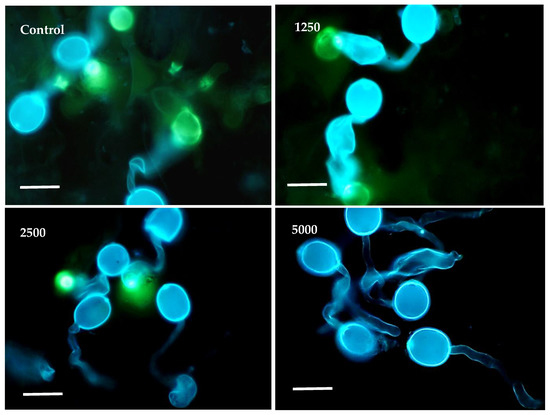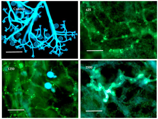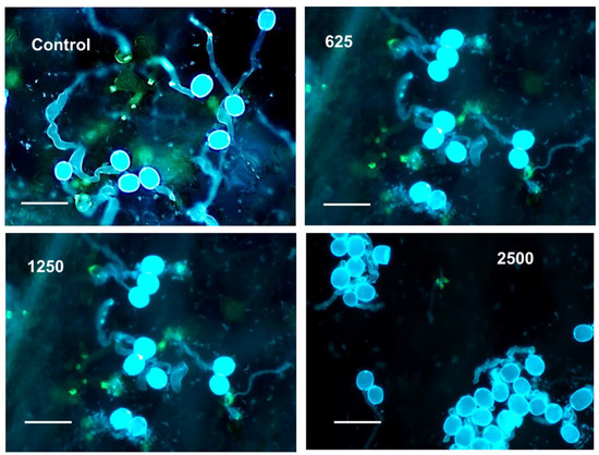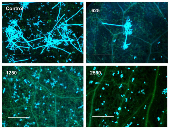 Fluorescence micrographs showing the effect of pure TTO (625, 1250, and 2500 µg/mL a.i.) on sporulation of B. lactucae in lettuce leaves. Sporophores and spores fluoresce blue. Bar = 50 µm. Photos were taken at 5 d after inoculation.