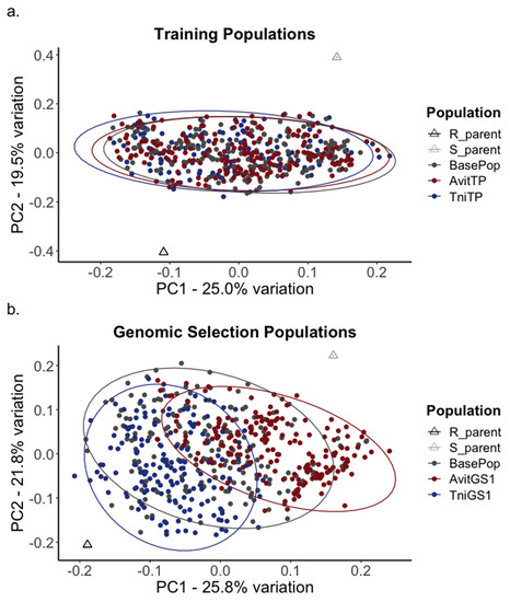 Principal component analyses (PCA) plots from genome-wide SNP marker matrix for genomic selection (a) training populations and (b) after one generation of selection (“GS1”). The percent variation explained by the first two principal components are given on the x- and y-axis respectively. The points representing the resistant (“R_parent”) and susceptible parent (“S_parent”) are triangle shaped and the points representing the base population (“BasePop”), A. vittatum and T. ni training and genomic selection populations are red and blue circles, respectively. Ellipses represent normal confidence intervals for each group.
