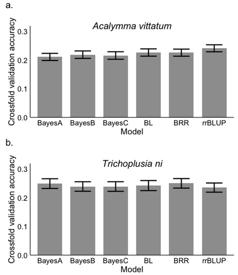 Comparison of different genomic selection models for training population cross-fold validation accuracy for resistance to (a) Acalymma vittatum and (b) Trichoplusia ni. The model abbreviations are as follows: “BL” is Bayesian Lasso, “BRR” is Bayesian Ridge Regression, and rrBLUP is a ridge-regression best linear unbiased predictor (BLUP), which is equivalent to GBLUP. The error bars represent one standard error.