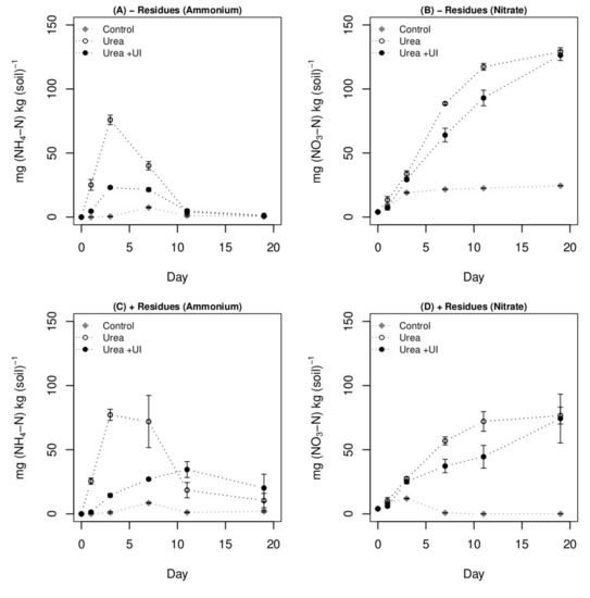 Urea as the N-source led to peak concentrations of ammonium-N on the third day of the experiment (−wheat straw: 76 mg N kg soil−1; +wheat straw: 77 mg N kg soil−1). For urea + UI, peak concentrations of ammonium-N were observed on Day 3 (−wheat straw: 23 mg kg soil−1) and Day 11 (+wheat straw: 35 mg kg soil−1). These days must be regarded as the points in time where the rate of nitrification exceeded the rate of urea hydrolysis (Figure 1).